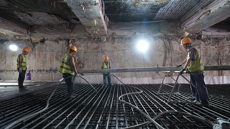自2021年7月車站主體結(jié)構(gòu)正式進入施工以來,歷時357天完成主體結(jié)構(gòu)封頂,在面對各工程交錯施工帶來的風險高、難度大、施工作業(yè)面狹小、地下管線眾多、施工組織復雜、工期緊等因素影響,項目部不等不靠,見縫插針,積極與各管線產(chǎn)權(quán)單位協(xié)調(diào),不斷優(yōu)化管線遷改和交通疏解方案。在前期技術(shù)準備、質(zhì)量控制、安全措施和應(yīng)急預案等方面做了全面部署,多次組織專家進行方案優(yōu)化論證。