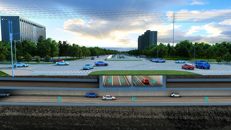 宿松路2標(biāo)全長2815m,北起繞城高速,下穿壩下路、繁華大道、軒轅路,上跨花園大道、南至慈光路。宿繁交口新建雙層下穿隧道,宿松路隧道位于負(fù)二層,長1250m,繁華大道隧道位于負(fù)一層,長349m。新建花園大道跨線橋一座,長420m;同時,新建壩下路、智能科技園人行天橋2座。