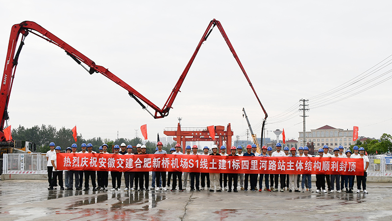 近日,由安徽省交通建設股份有限公司承建的合肥新橋機場S1線土建施工總承包1標四里河路施工現場,伴隨最后一塊頂板的澆筑完成,標志著四里河路車站主體結構順利實現封頂。