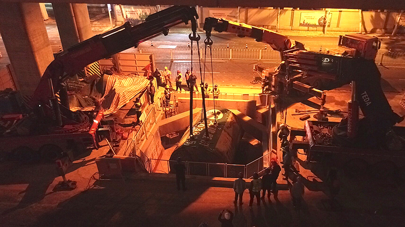 吊裝方案經(jīng)多次比選、充分論證和現(xiàn)場(chǎng)核查,最終采用三臺(tái)折臂吊車,進(jìn)行三次接力吊裝的方式,將頂管機(jī)從井中提升至運(yùn)輸車輛,完成吊裝作業(yè)。
