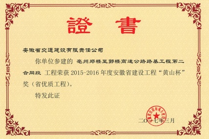 日前, 2015-2016年度省建設工程“黃山杯”獎項評選結果揭曉,由安徽省交通建設股份有限公司(以下簡稱安徽交建)施工建設的亳州鄭樓至郭樓高速公路路基工程第二...