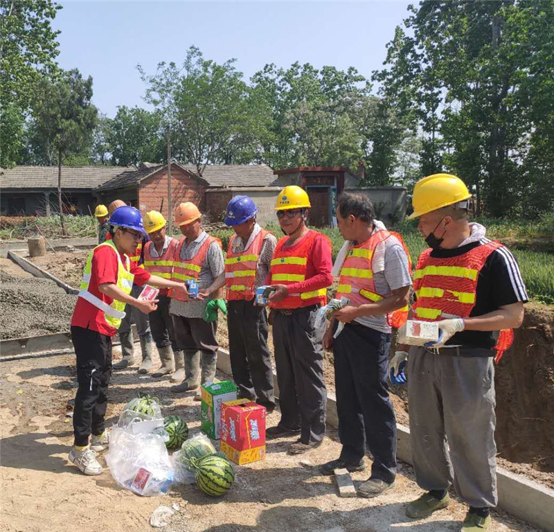 施工加速度的背后是汗水。在五一期間,界首市氣溫連續一周高達36℃,項目部完善高溫作業應急處理預案,合理安排作息時間,減少了白天室外作業時間,披星戴月、節假無休的搶工模式也成了家常便飯。“苦是苦了點,但也是鍛煉的好機會,雖然任務重,但是大家戰斗在一起,共同為榮譽而戰,多苦也是值得的。”項目部管理人員這樣說道。為保障每一位工人的人身安全,項目部還積極向作業人員宣傳高溫期間防暑降溫基本常識和救援知識,增強高溫天氣預防中暑的安全意識和急救能力,并為各工區施工人員發放防暑降溫物品。